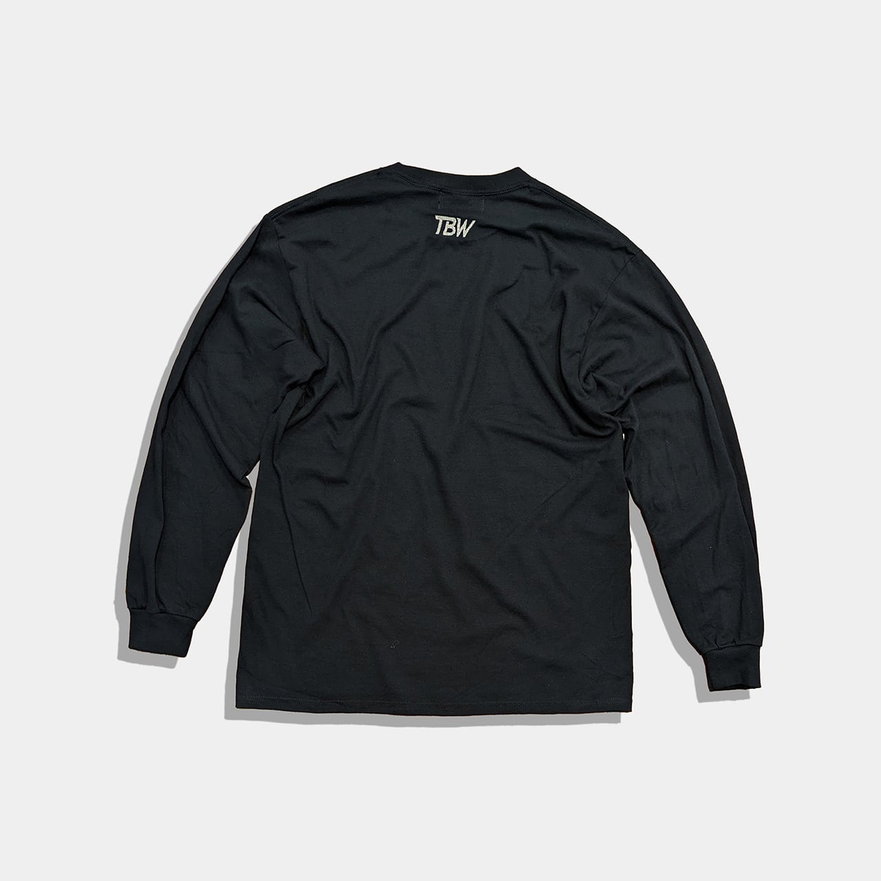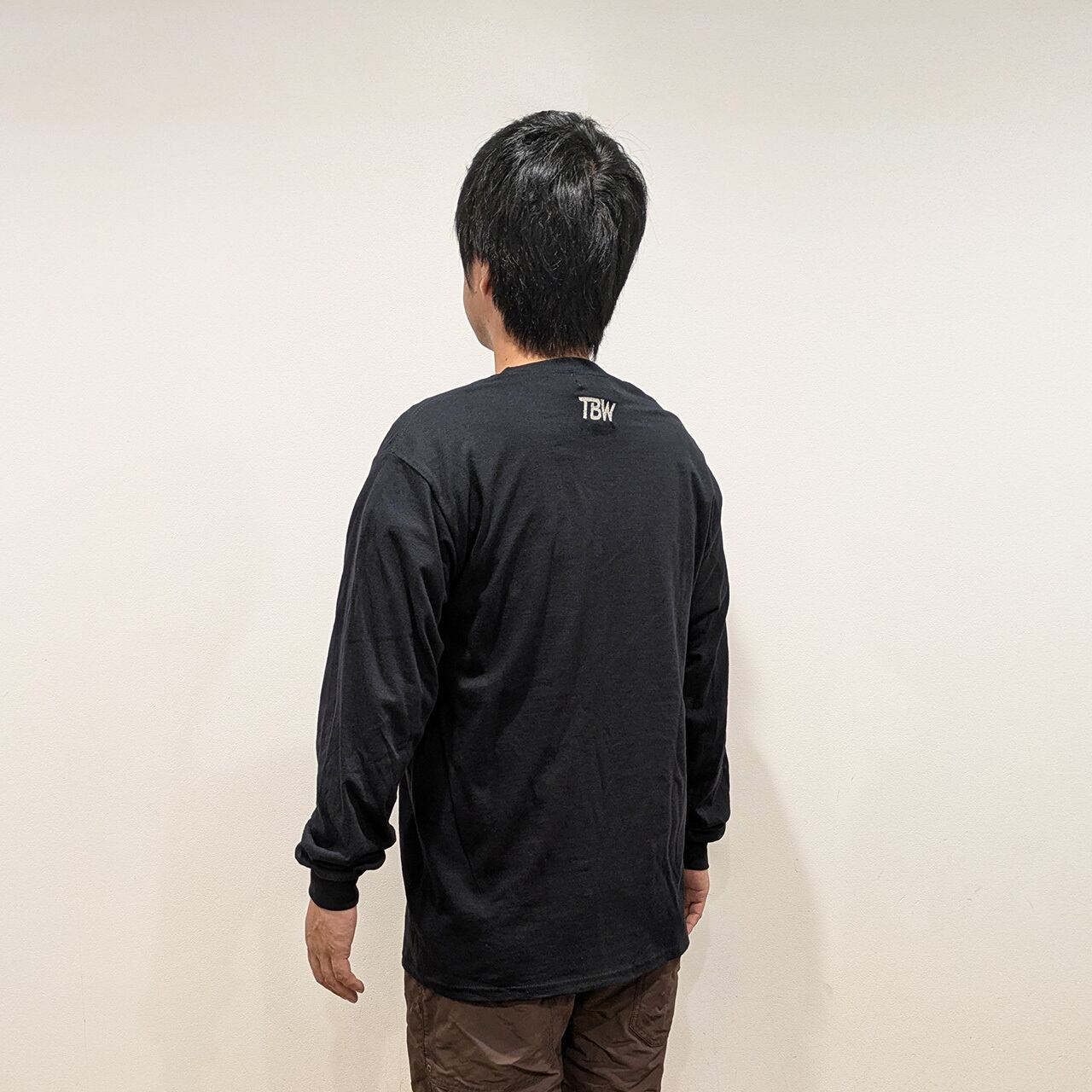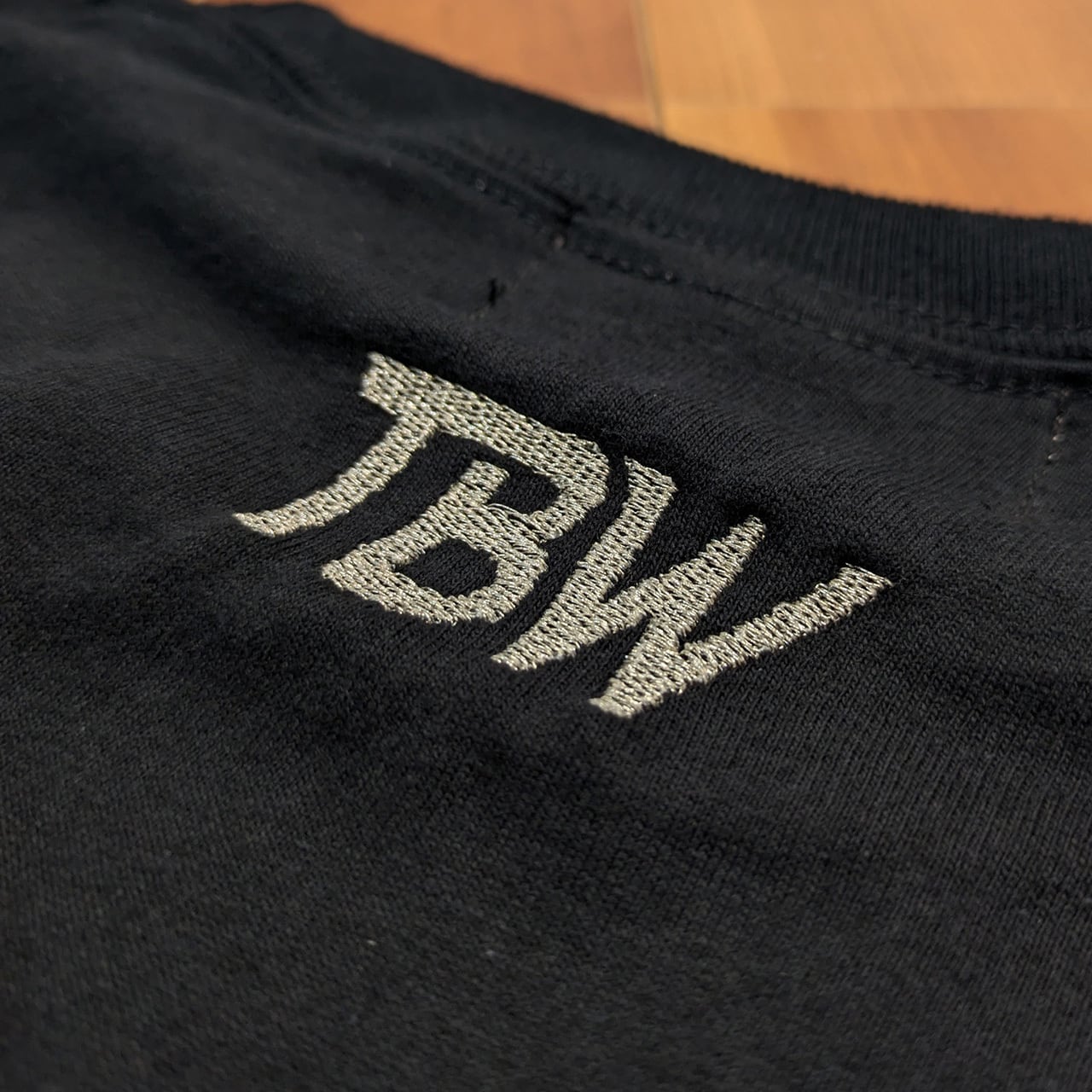 フロント左胸に、THE BACK WATERアイコンロゴを、背中上部にはTBWロゴを。