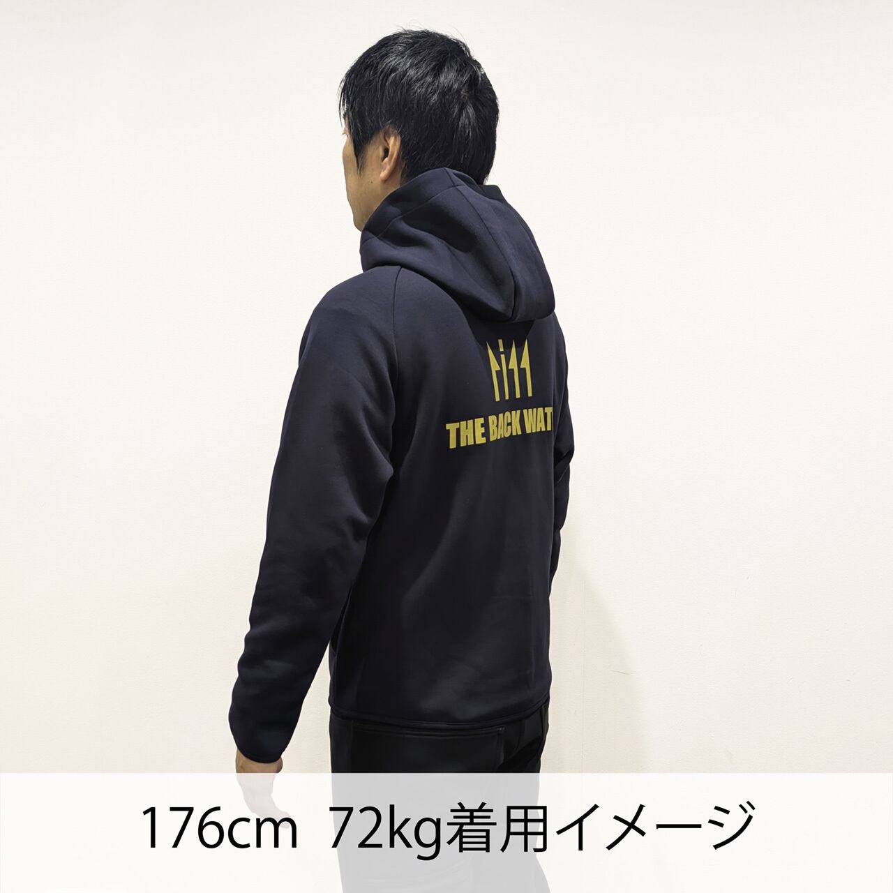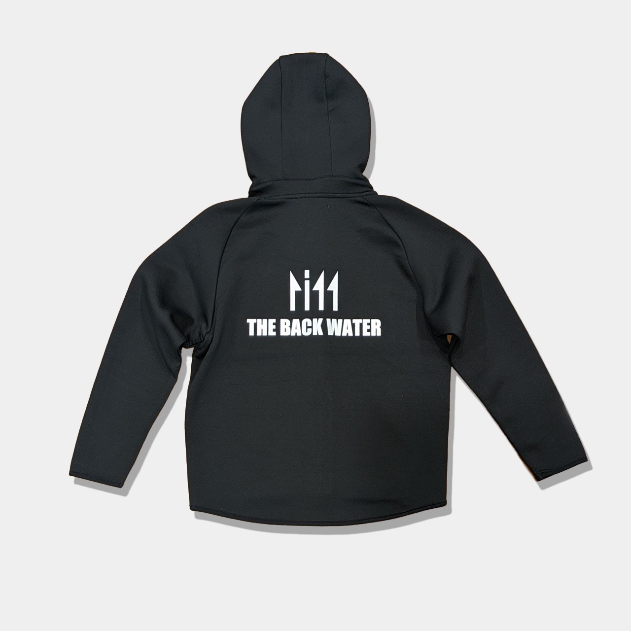 フロントにはTHE BACK WATERアイコンロゴをシルバー刺繡、背中には大胆にロゴプリントを施したパーカー。