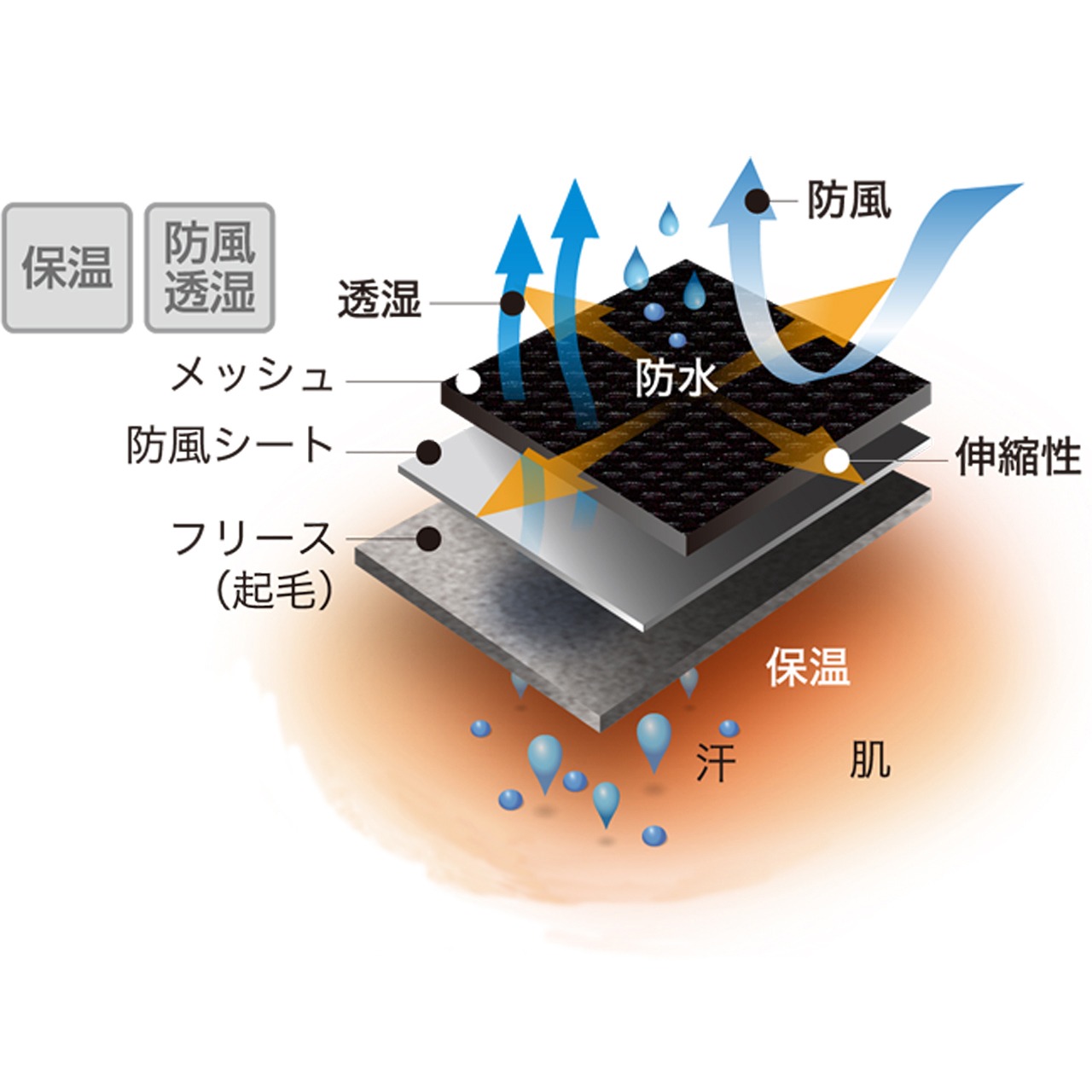 老舗サイクルウェアメーカーが開発した3レイヤー生地は、表が目の細かいメッシュ=速乾、中にシート=防風と透湿、裏がフリース=保温、の素晴らしい素材。