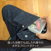 Characterized by large front pockets, making it easy to access your belongings even while seated. If sitting is uncomfortable due to items in the back pockets, you can reduce the inconvenience by storing them in the large front pockets.